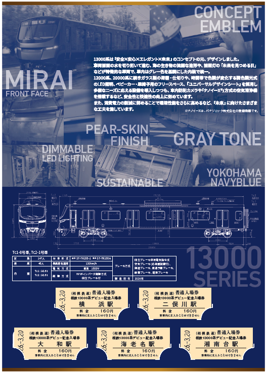 同入場券は、相鉄線5駅の「B型硬券普通入場券」をYOKOHAMA NAVYBLUE(ヨコハマネイビーブルー)」を基調とした台紙にセットしています。台紙の裏面には、同車両の象徴である前照灯「未来を見つめる目」を採用し、中面は2025年5月より公開している13000系のプロモーション動画「SOTETSU 13000 SERIES MANUFACTURING STORIES」の一部シーンを切り取りデザインしています。
