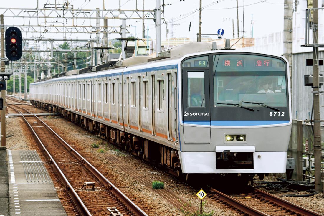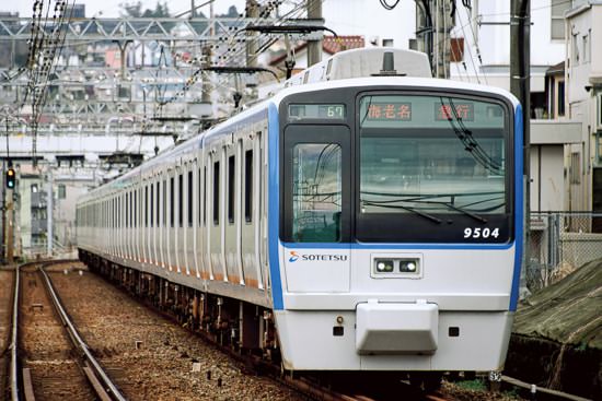 先頭車両の前面には大きな曲面ガラスが取り付けられ、スピード感のある前面傾斜型のデザインとなっています。相鉄の車両では初の車いすスペースと非常通報装置のほか、8000系同様、大容量のVVVFインバータ制御装置と車両情報装置などを採用しています。