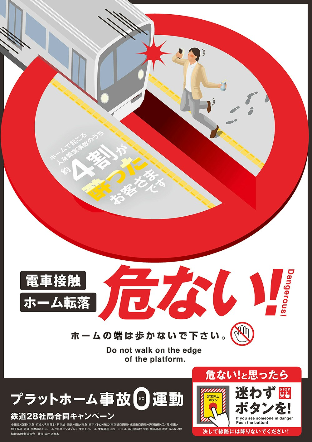 相模鉄道では、鉄道28社局合同で、お客さまに安全に駅をご利用いただくために、プラットホーム上での列車との接触やホームから線路への転落について注意喚起をするとともに、危険と感じたときは列車非常停止ボタンを押していただくことを目的として、「プラットホーム事故0(ゼロ)運動」を実施します。