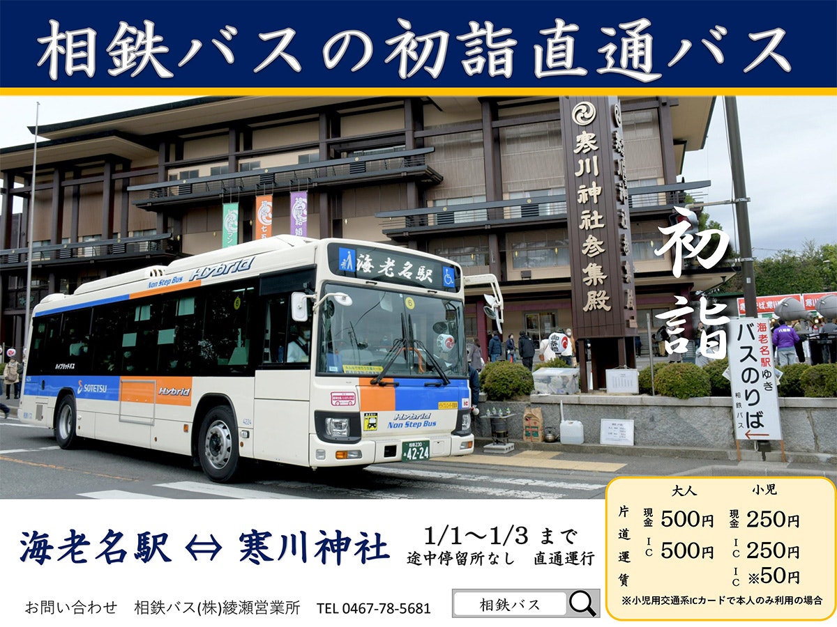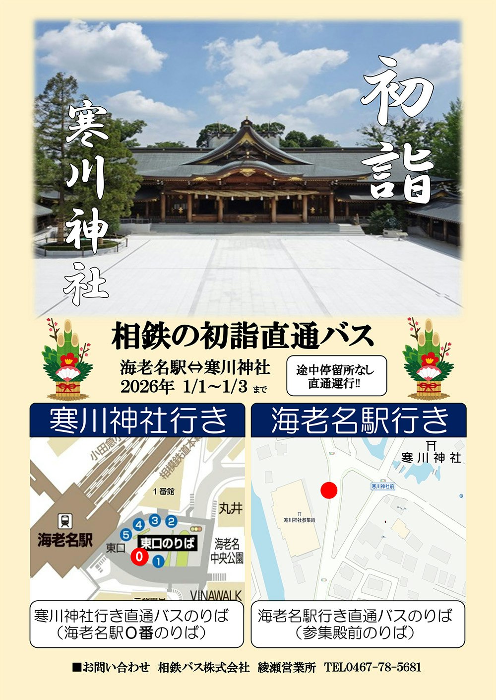 2026年1月1日(木・祝)から1月3日(土)まで、寒川神社初詣直通バスを以下のとおり運行いたします。お客様のご利用をお待ちしております。