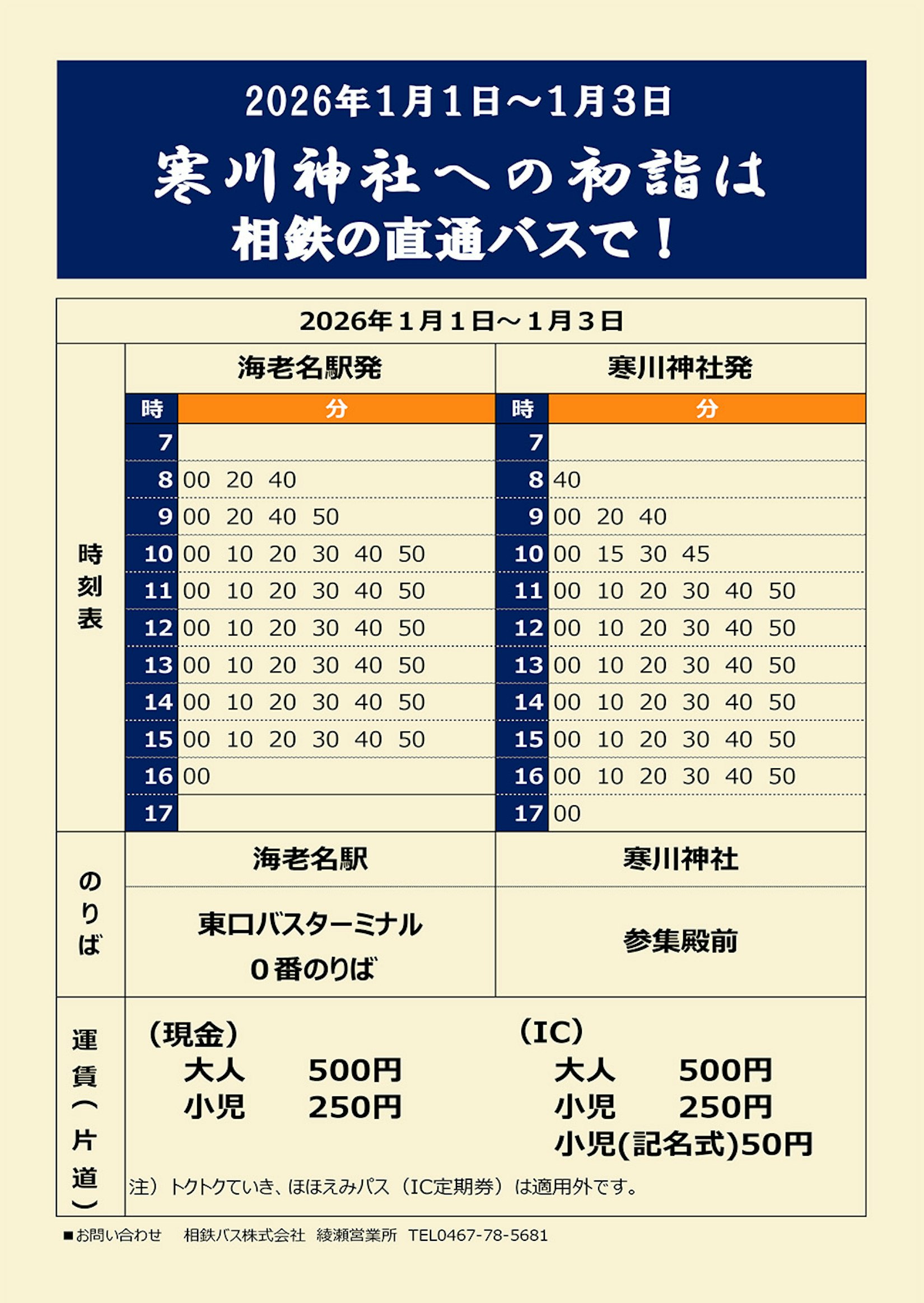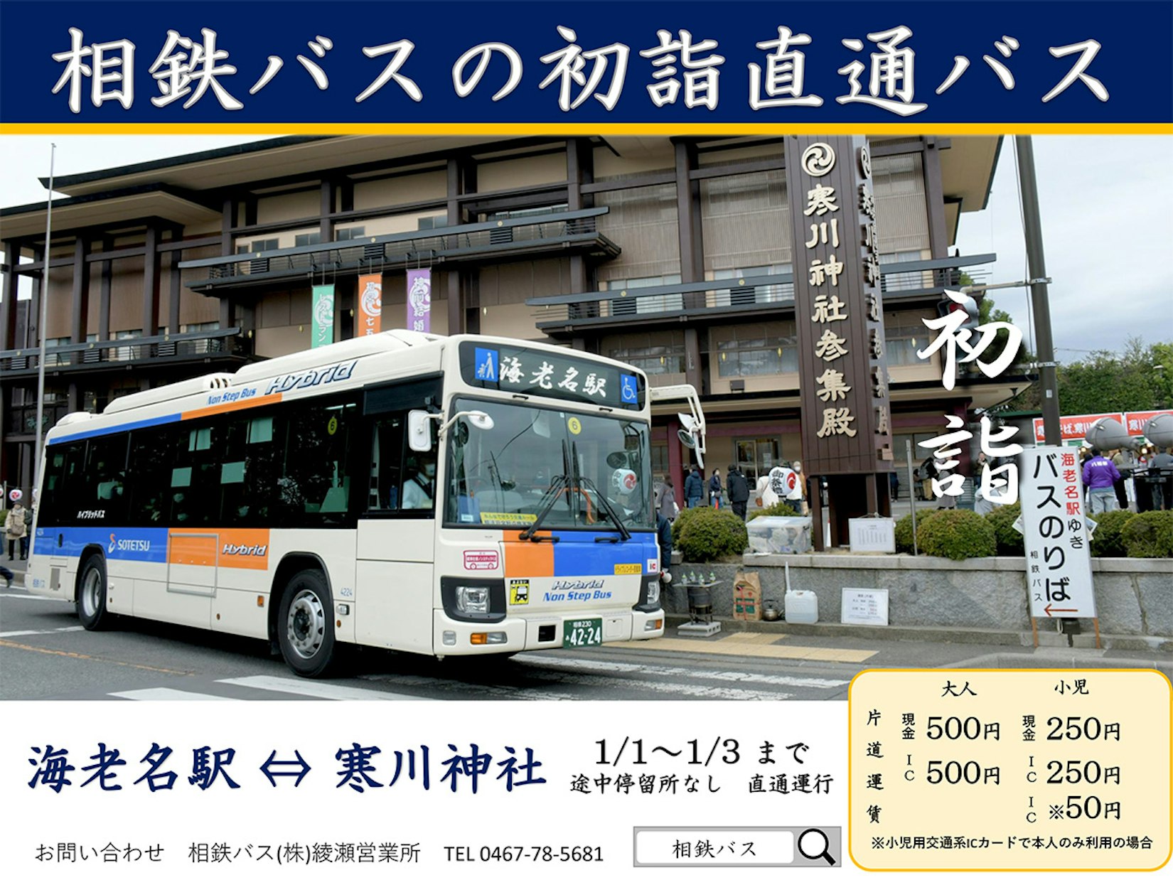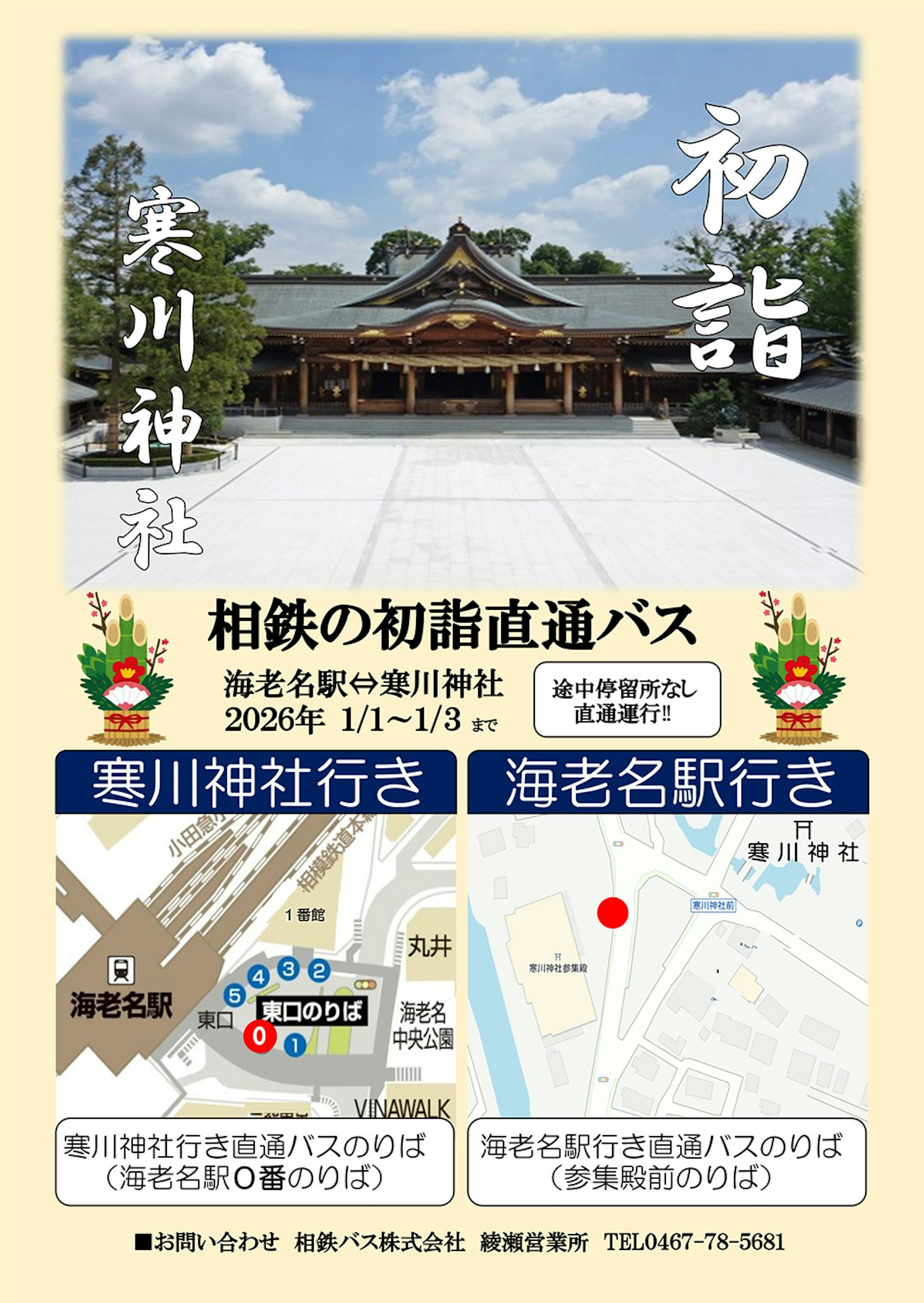 2026年1月1日(木・祝)から1月3日(土)まで、寒川神社初詣直通バスを以下のとおり運行いたします。お客様のご利用をお待ちしております。