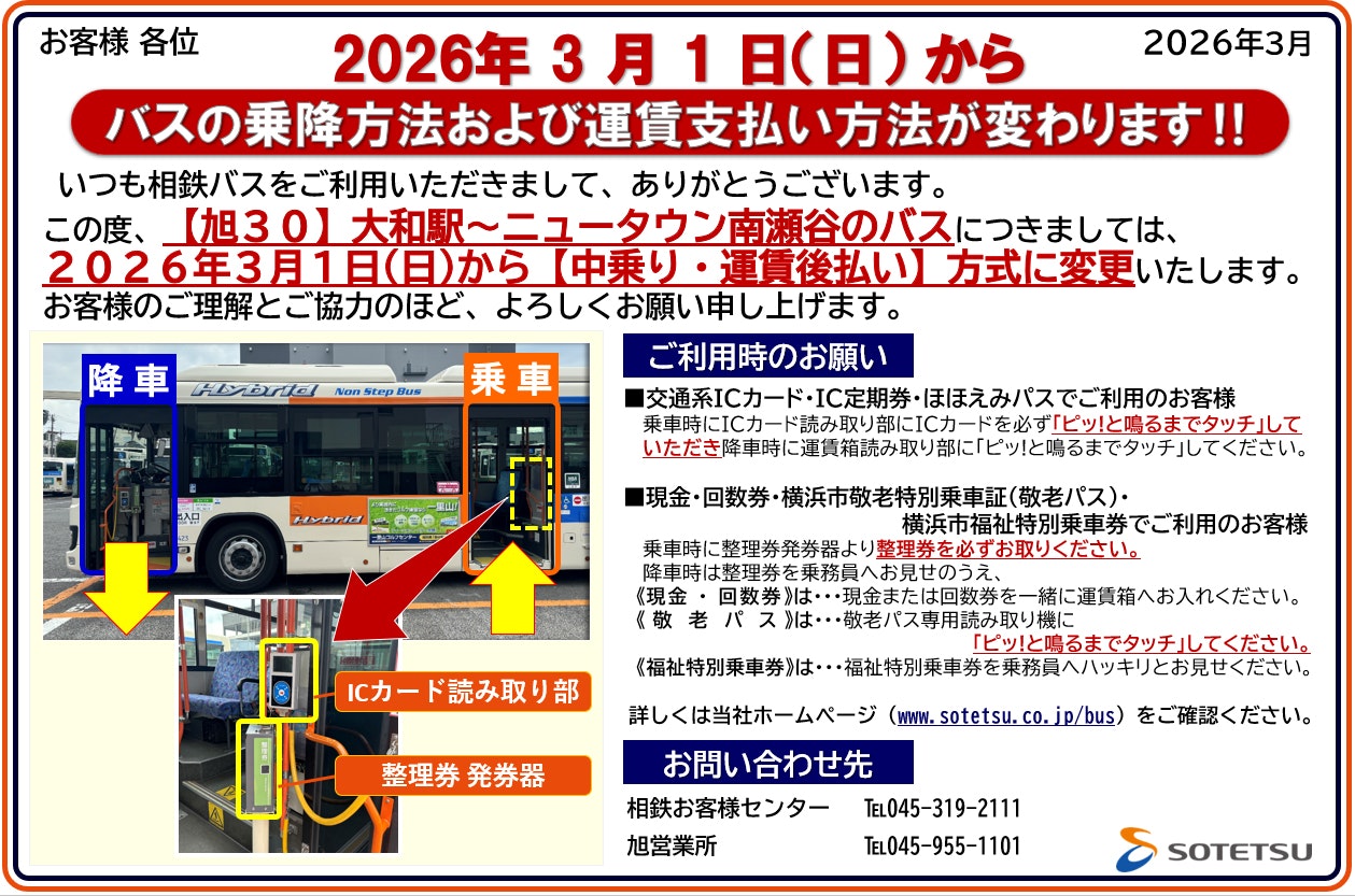 相鉄バス旭営業所における旭30系統におきまして、2026年3月1日(日)より、乗降方法および運賃のお支払い方法が変更となります。あらかじめご確認のうえ、ご利用いただきますようお願い申し上げます。