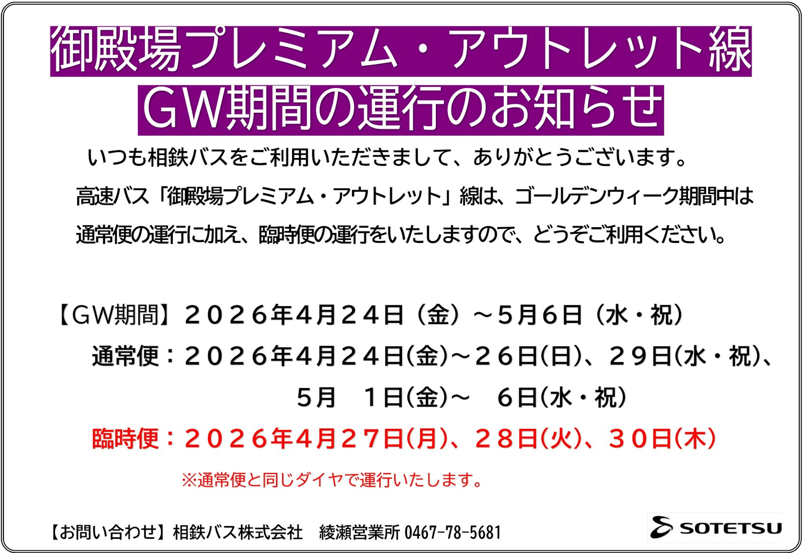 高速バス「御殿場プレミアム・アウトレット」線は、ゴールデンウィーク期間(2026年4月24日(金)~ 5月6日(水・祝))は通常便の運行に加え、臨時便の運行をいたします。ぜひご利用ください。