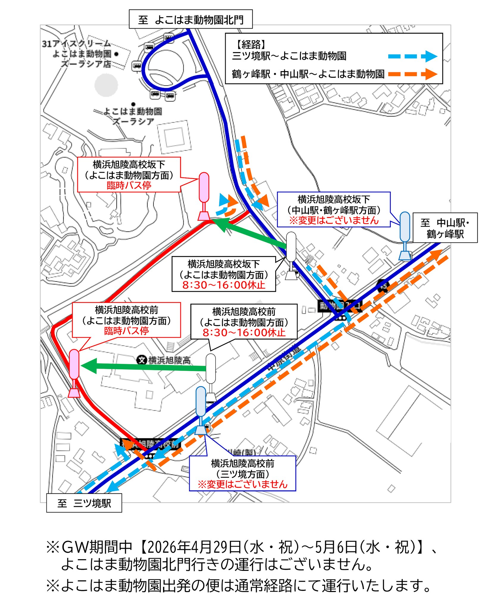 ※8:30~16:00間、よこはま動物園行きは迂回運行および臨時バス停を使用いたします。