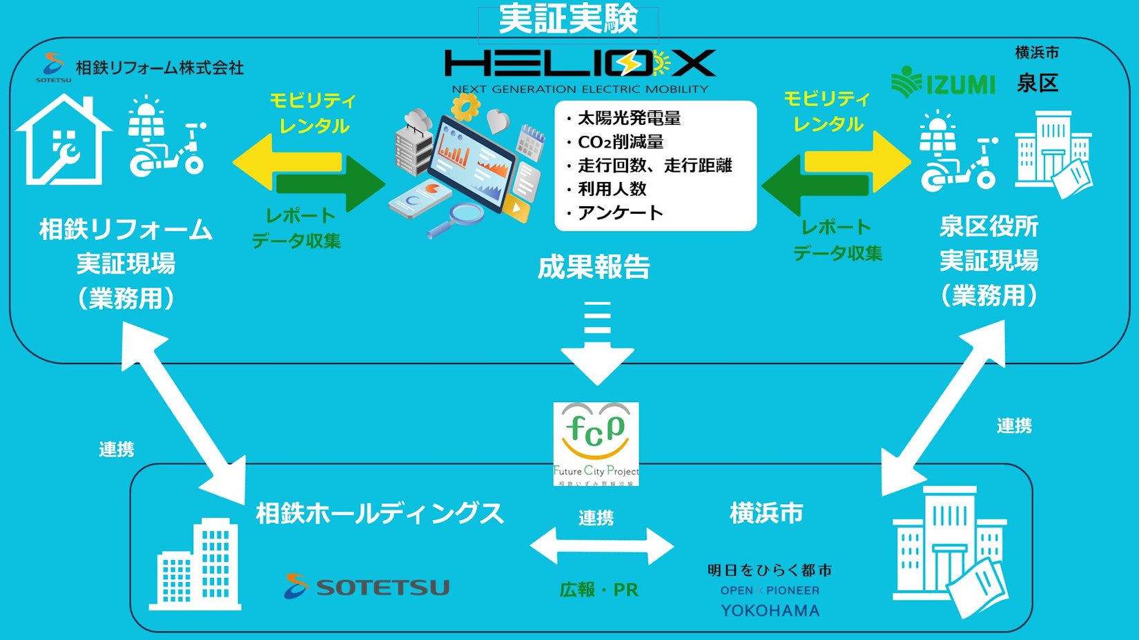本実証実験では、相鉄HDと横浜市が主体となり、太陽光発電付きモビリティの課題検証に取り組みます。横浜市においては泉区役所、相鉄グループにおいては相鉄リフォームにて、それぞれ業務用の車両としてヘリオス社の太陽光発電付きモビリティを試験的に導入し、相鉄いずみ野線緑園都市駅およびいずみ中央駅付近(横浜市泉区)で実施します。なお、実証実験の各種データの収集・分析は、ヘリオス社が担います。