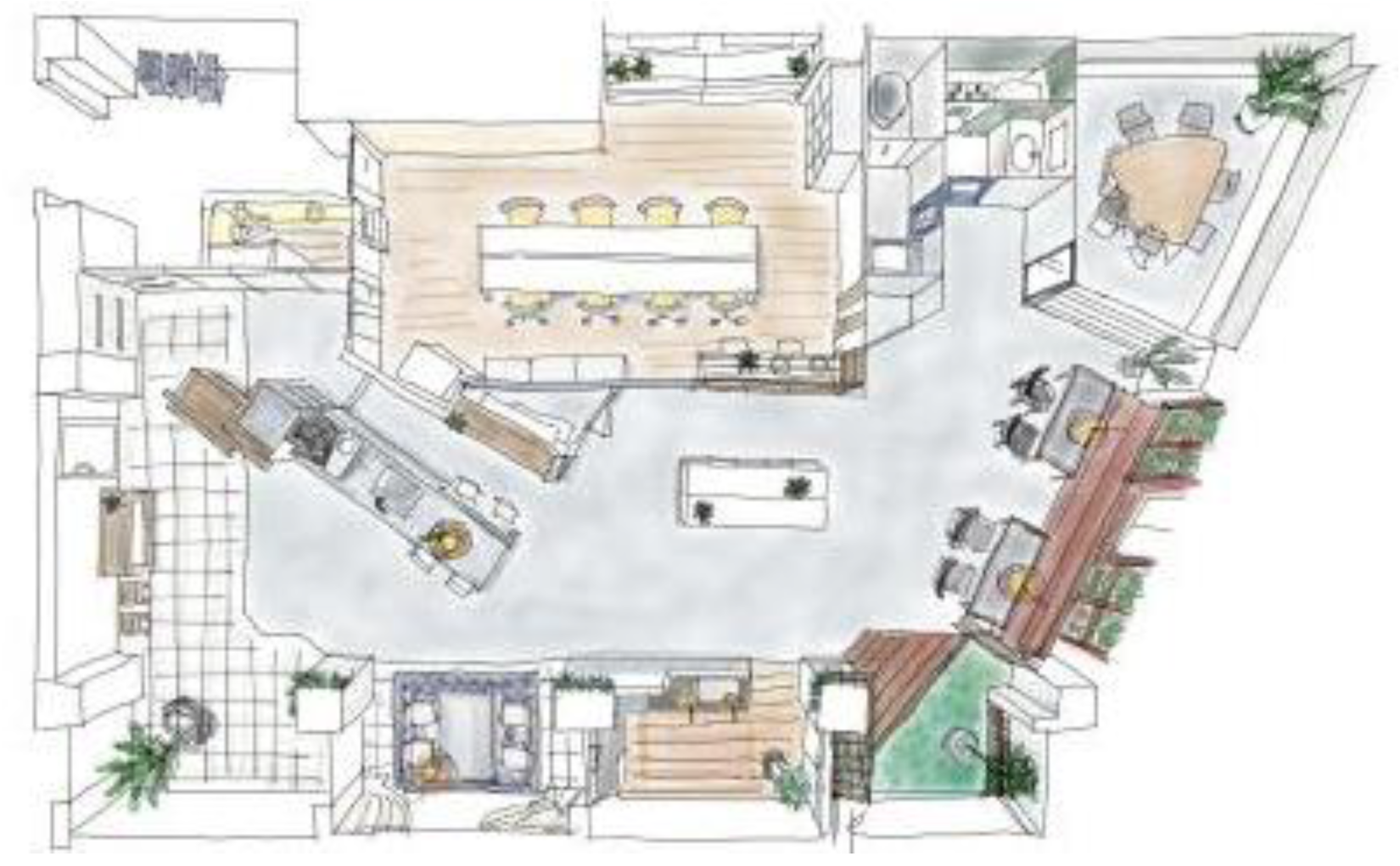 - 中央には「LIVE KITCHEN」と称した、大型フルフラットキッチンを配置。料理教室などのレンタルスペースとしても活用いただけます。