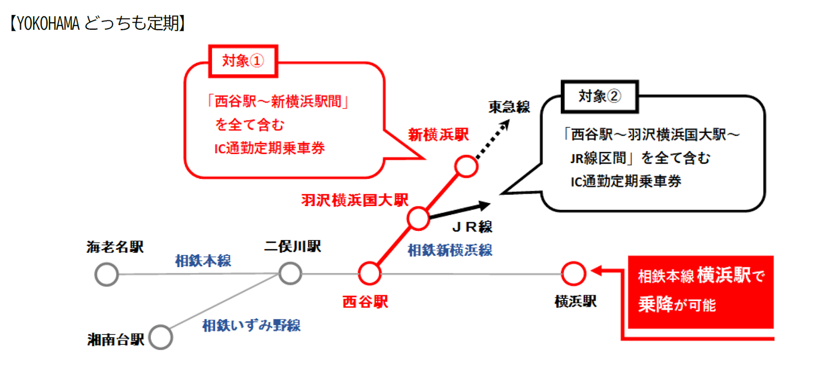 ・特別な申請や追加で運賃をお支払いいただくことなく、相鉄本線 横浜駅での乗降が可能(「YOKOHAMA どっちも定期」対象区間)