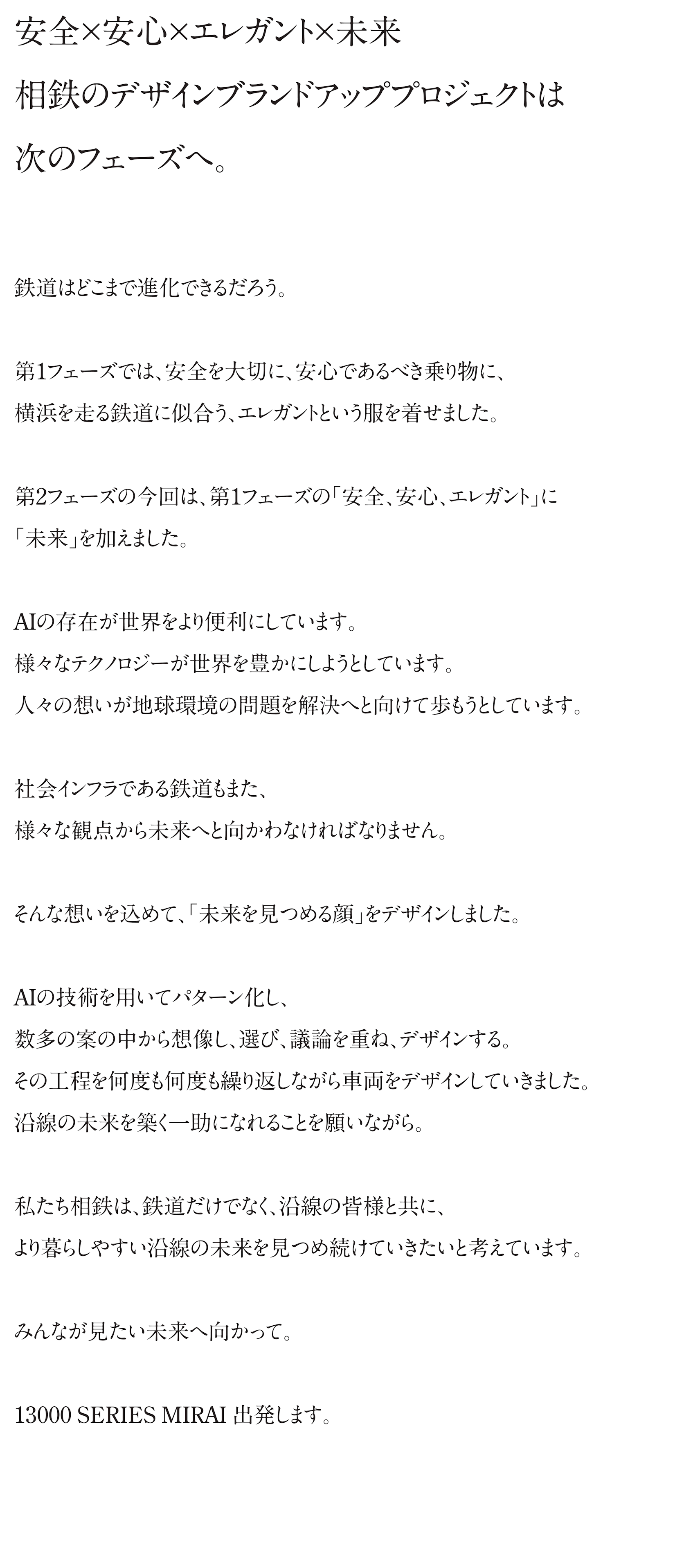 相模鉄道では、これまでも「デザインブランドアッププロジェクト」の概念に基づいて「12000系」(相鉄・JR直通線用車両)や「20000系」、「21000系」(相鉄・東急新横浜線用車両)」などを導入し、沿線のブランドイメージ向上に尽力してまいりました。今後、相鉄線沿線では、相鉄本線「瀬谷駅」から北に約2キロの場所で、「2027年国際園芸博覧会(GREEN×EXPO 2027)」が開催されるなど、これまで以上に相鉄線沿線に沿線外の方々が訪れます。お客さまの一番のタッチポイントである車両に、「新コンセプト」に基づいた新型車両を順次導入することで、「次のステージ」へ、「未来」へ、相鉄線や相鉄線沿線のさらなる認知度向上・イメージ向上につなげてまいります。