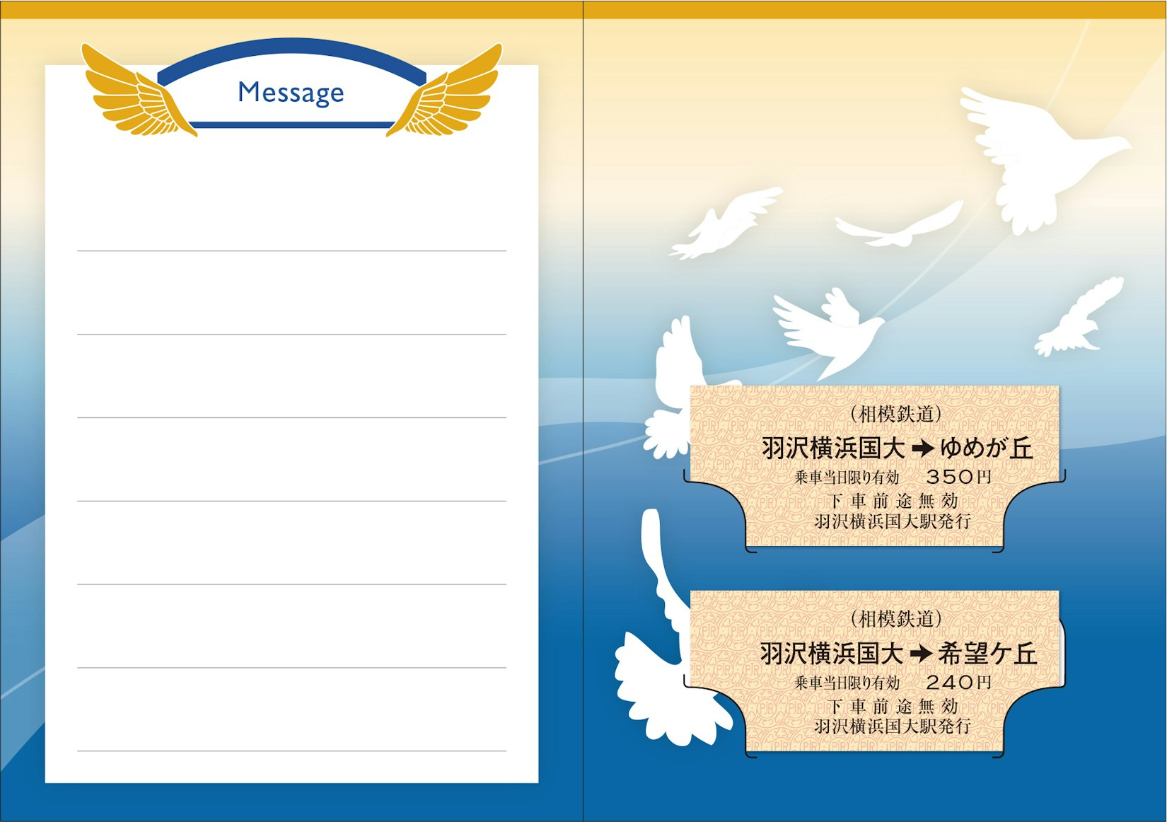 本乗車券は、相鉄線のB型硬券普通乗車券(1,200セット)で、羽沢横浜国大駅⇒ゆめが丘駅の「夢に向かって羽ばたくきっぷ(乗車券)」と、羽沢横浜国大駅⇒希望ケ丘駅の「希望に向かって羽ばたくきっぷ(乗車券)」の2枚セットになっています。