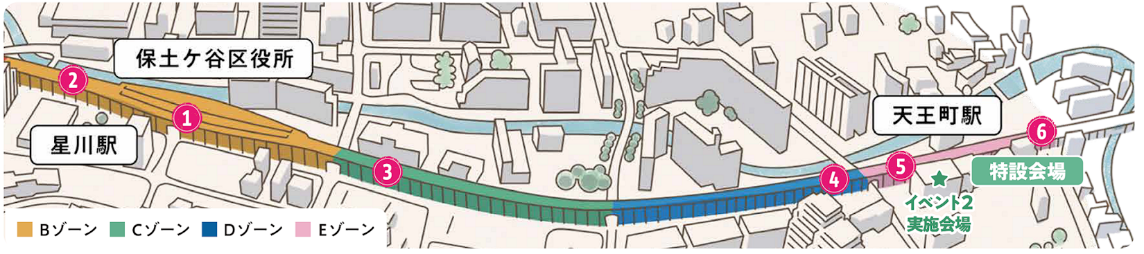 計画では、相模鉄道本線(星川駅~天王町駅)連続立体交差事業において鉄道高架化により創出された、全長約1.4㎞のエリアをA~Eゾーンの5つのゾーンに分けて開発します。この開発エリアは、2020年12月に横浜市保土ケ谷区が策定した「星川駅周辺地区総合的なまちづくりガイドライン」に基づき、「駅周辺と高架下」を中心として、今まで分断されていた地区の南北を一体化したまちづくりを推進するとともに、星川駅周辺地区全体の利便性を向上し、にぎわいと交流を創出するまちづくりを推進するエリアとしています。