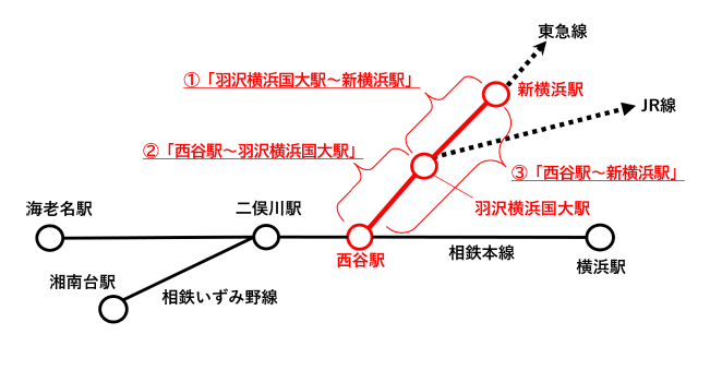 - 定期区間に「羽沢横浜国大駅~新横浜駅」、「西谷駅~羽沢横浜国大駅」または「西谷駅~新横浜駅」のいずれかを含むこと