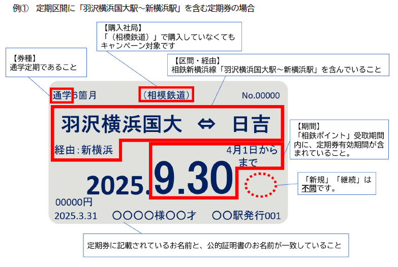 定期区間に、①「羽沢横浜国大駅~新横浜駅」、②「西谷駅~羽沢横浜国大駅」、③「西谷駅~新横浜駅」いずれかの区間を含み、定期券の有効期間が「相鉄ポイント」受け取り期間内である通学定期券をお持ちの方を対象として、「相鉄ポイント」をプレゼントします。