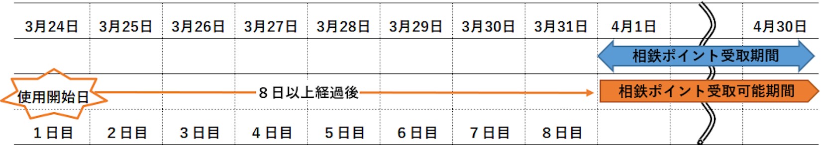 <例>3月24日に使用開始の定期券の場合、4月1日からポイントの受け取りが可能となります。