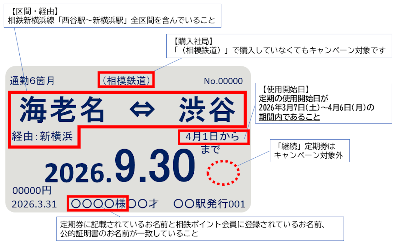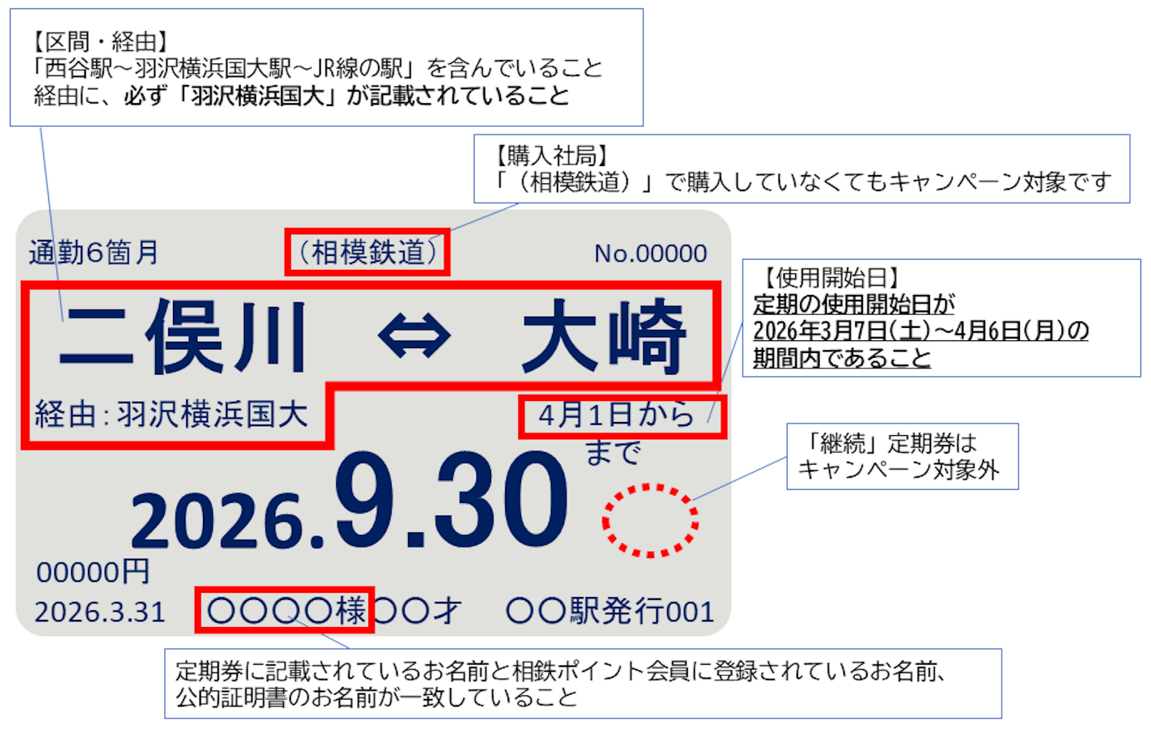 - 定期券の使用開始日が2026年3月7日(土)~4月6日(月)の期間内