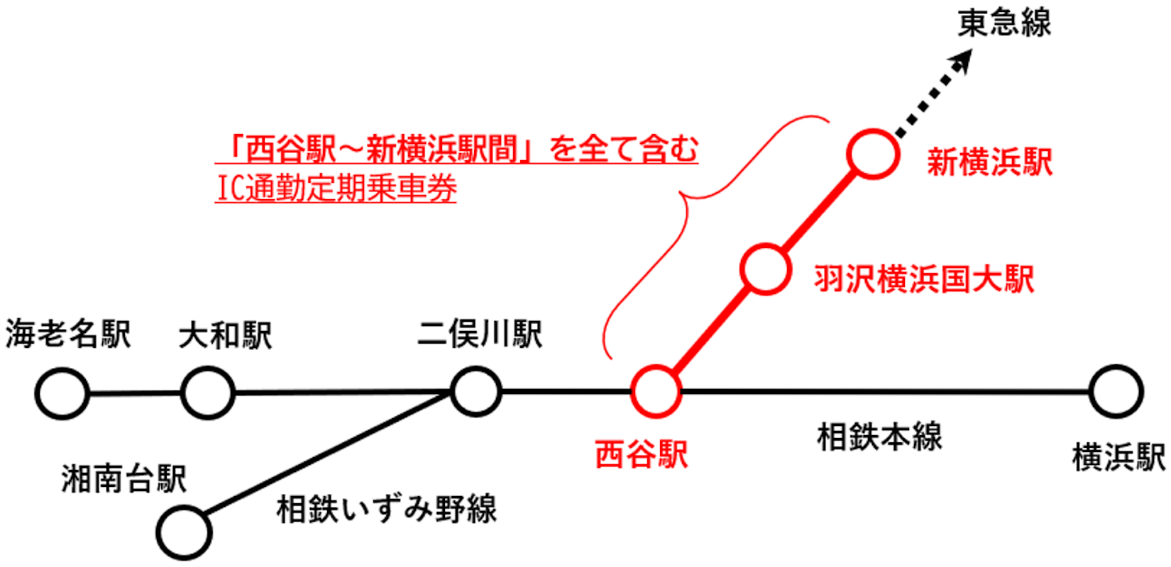 - 定期区間に「西谷駅~新横浜駅」または「西谷駅~羽沢横浜国大駅~JR線区間」を全て含む