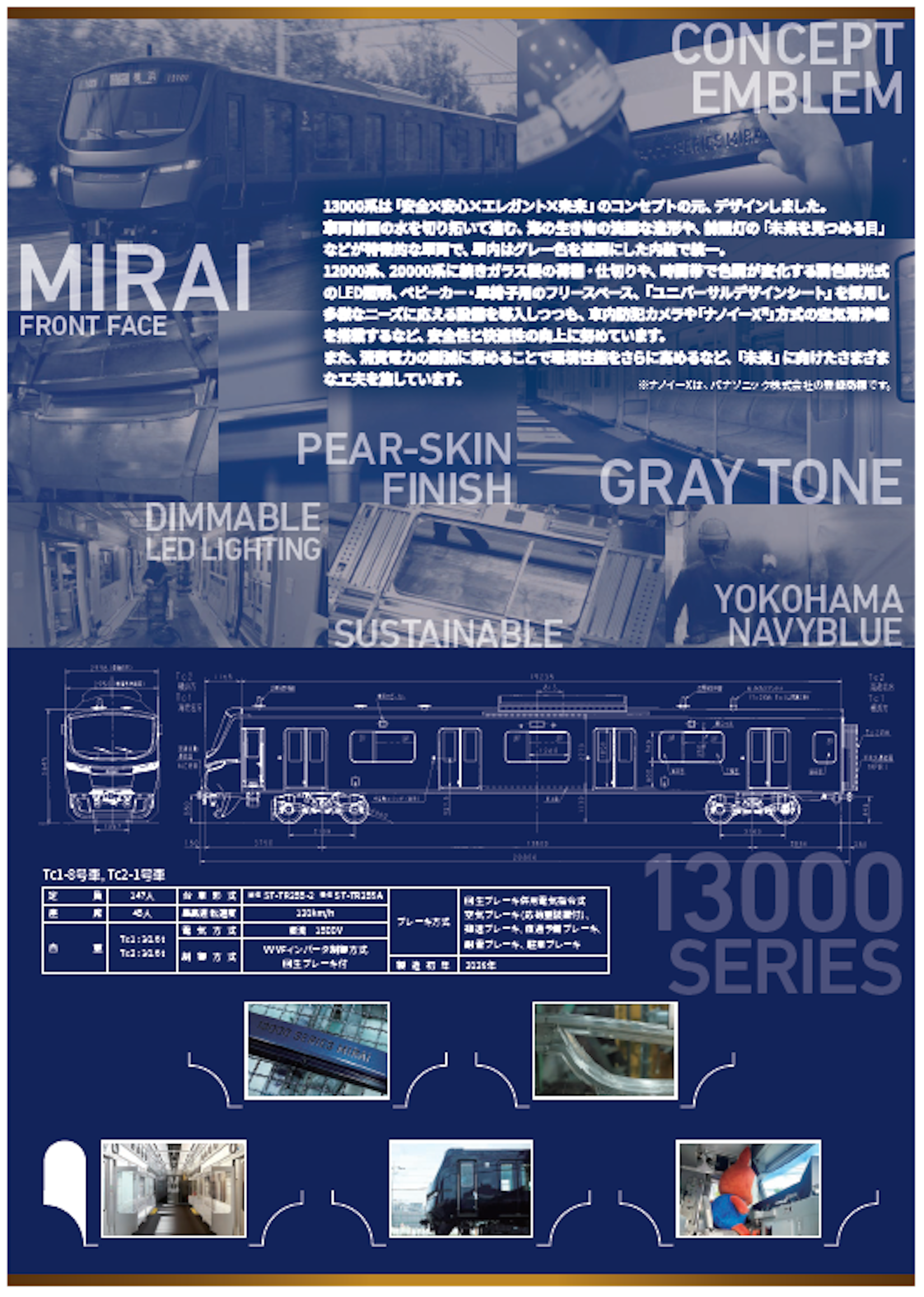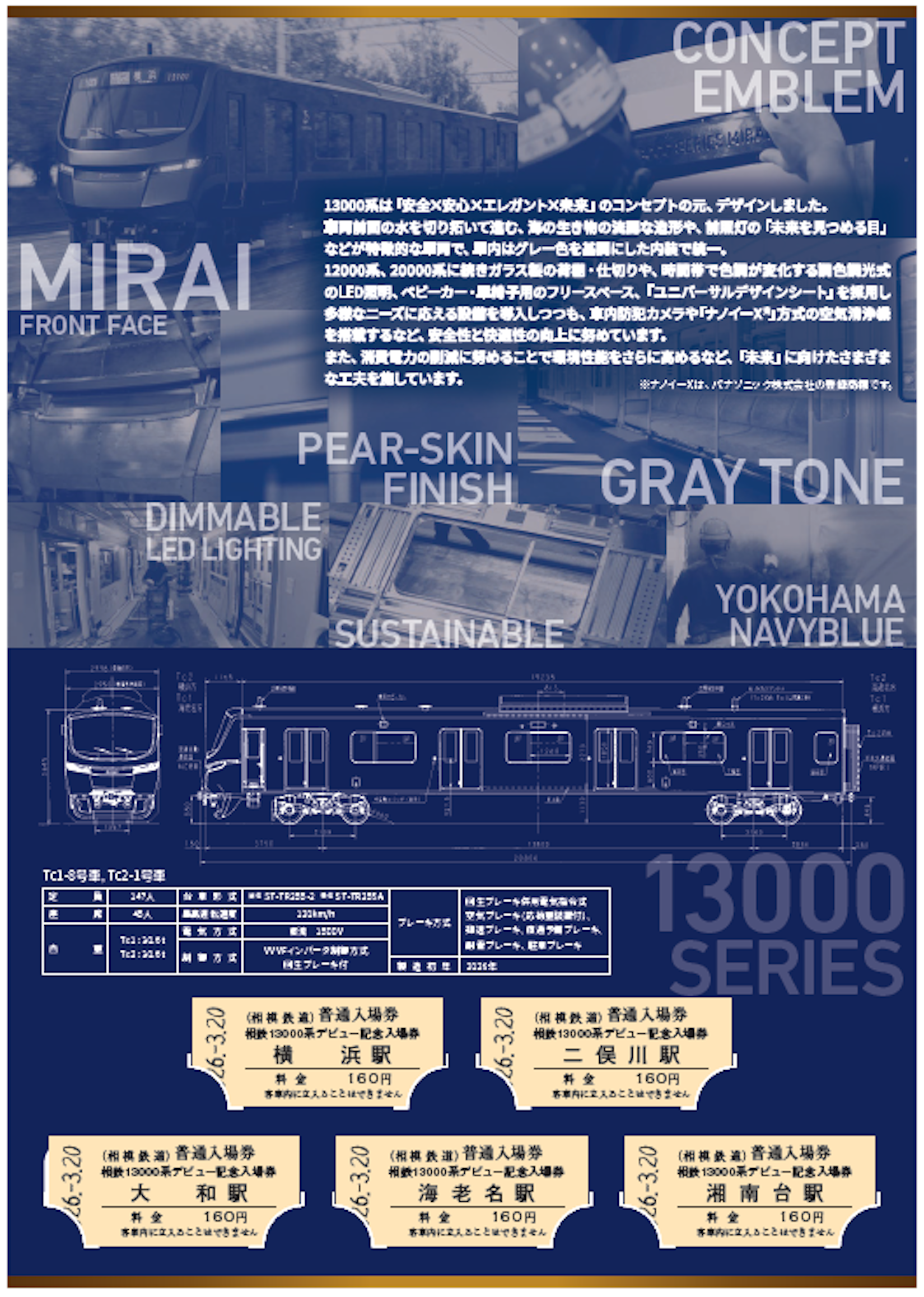 同入場券は、相鉄線5駅の「B型硬券普通入場券」をYOKOHAMA NAVYBLUE(ヨコハマネイビーブルー)」を基調とした台紙にセットしています。台紙の裏面には、同車両の象徴である前照灯「未来を見つめる目」を採用し、中面は2025年5月より公開している13000系のプロモーション動画「SOTETSU 13000 SERIES MANUFACTURING STORIES」の一部シーンを切り取りデザインしています。