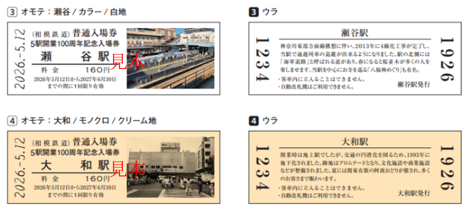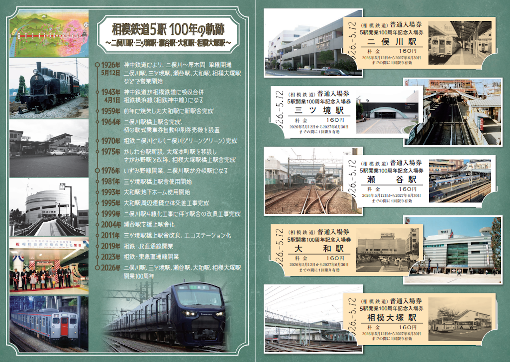同入場券セットは、同区間の開業と同時に営業を開始した相鉄線5駅(二俣川駅、三ツ境駅、瀬谷駅、大和駅、相模大塚駅)の「D型硬券普通入場券」を特別仕様の専用台紙にセットしています。開業当時の懐かしい駅舎の姿や車両の写真、1世紀にわたる歩み「100年の軌跡」を掲載しています。